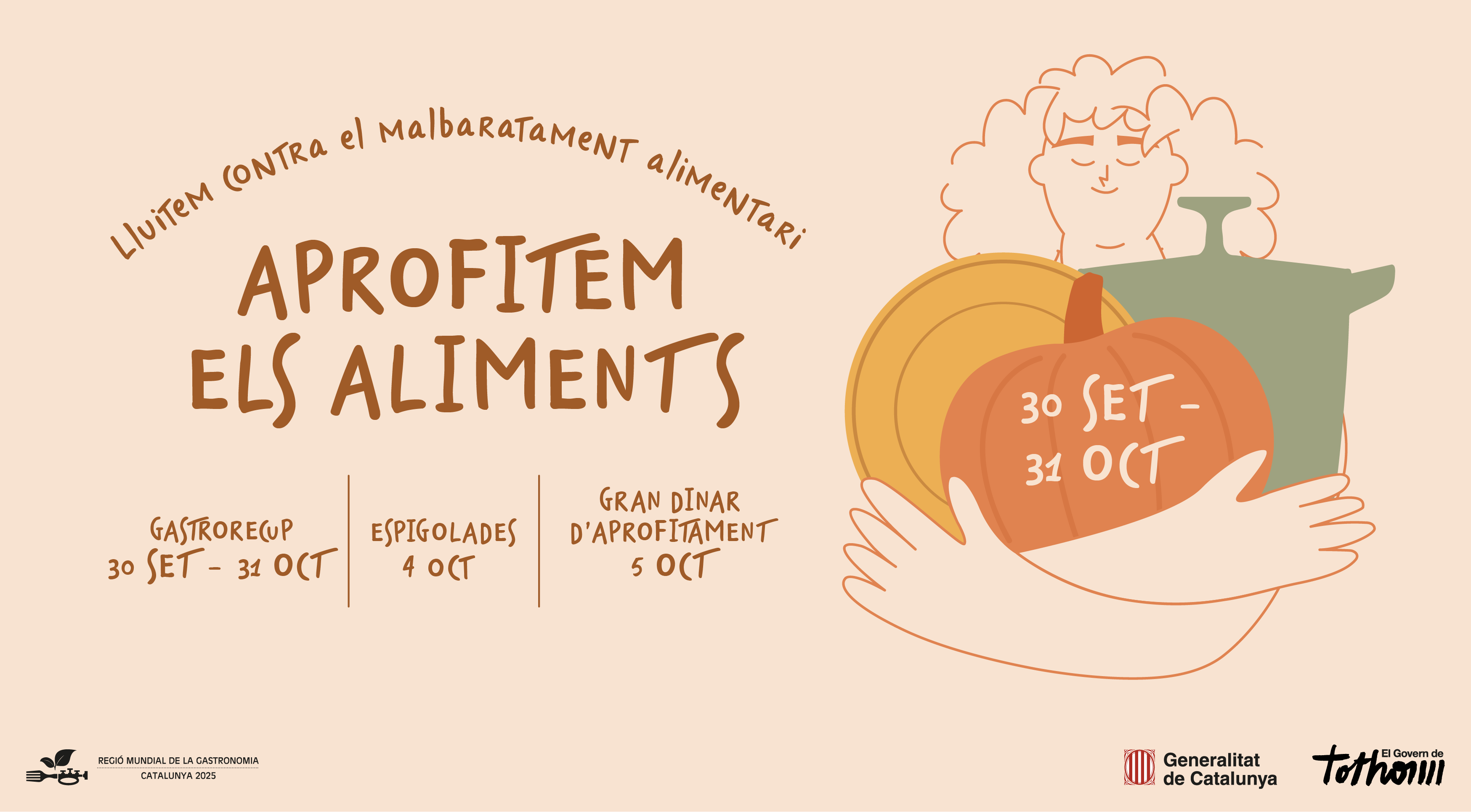 La campanya del Govern s’emmarca al voltant del 29 de setembre, Dia Internacional de la Conscienciació sobre les Pèrdues i el Malbaratament Alimentaris, i compta amb la col·laboració i participació del sector de la restauració, la Fundació Espigoladors, la Plataforma Aprofitem els Aliments, l’Oficina Conjunta per l’Alimentació Sostenible així com d’altres entitats i organitzacions del sector agroalimentari.